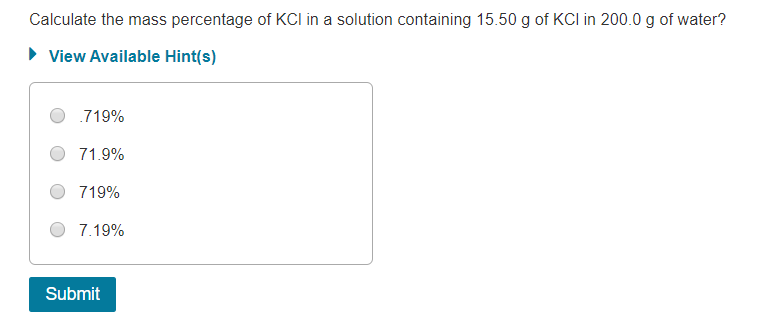 Calculate The Mass Percent Of A Solution Containing 2 5g Of Kcl In 50 G Of Water